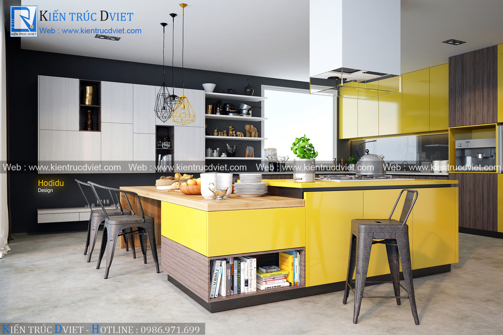 Mẫu thiết kế nội thất bếp ăn đẹp được kến trúc Dviet thiết kế mang phong cách hiện đại, với sự kết hợp của các vật lệu hiện đại và sự kết hợp, phối màu sắc đã đem lại vẻ đẹp cho khu bếp ăn.